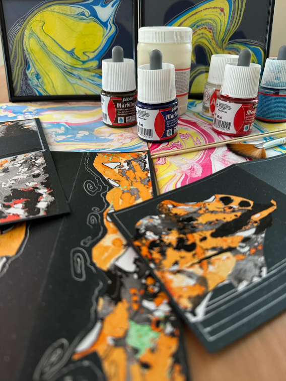 Teorinę dalį papildys praktinė veikla – marmuravimo (ebru) technikos pažinimas ir išbandymas. Dalyviai kurs originalius individualaus dizaino kūrinius (pasirinktinai): proginį atviruką (Kalėdoms, Velykoms ar kitoms progoms), knygos skirtuką, paveiksliuką - miniatiūrą marmuravimo technika.