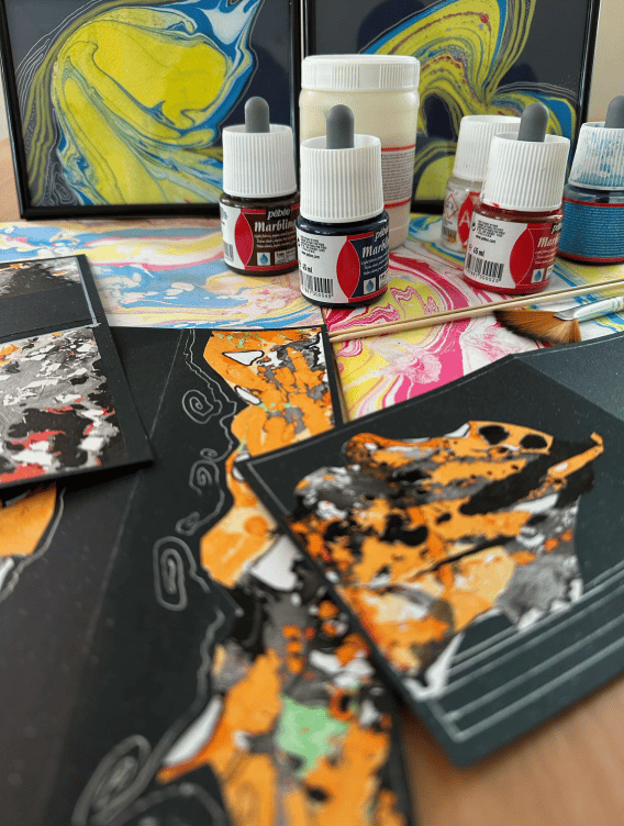 3. Sukurti dizaino kūrinį ( atvirukas, knygos skirtukas, miniatiūra ir pan.) naudojant marmuruotą ruošinį.