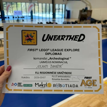 Būrelių „IT kodas“ ir “Robotika” vaikų (Markas Prunckus., Pijus Remesa., Joris Magyla., Benediktas Vagonis., Vakaris Šniras., Joris Smalskys, mokytojos Dominga Mikšėnaitė ir Sonata Grigaliūnienė) suburta komanda „Archeologinai“ dalyvavo FIRST LEGO League Explore lygos varžybose „Unearthed“, kurių tema – archeologija.